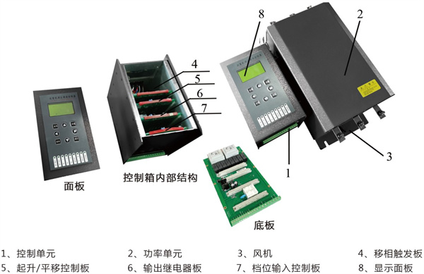 GVDJ控制器由控制單元和功率單元組成,兩者固定為一體。電氣連接方式通過矩形插座連線連接,控制單元由升降控制板(GV-002DI)/(平移控制板GV-003DI)、輸岀板(GV-004DI、GV-008DI)、檔位輸入控制板(GV-009DI)、移相觸發(fā)板GV-005DI)、顯示板(GV-015DI)及案板(GV-006DI)組成。功率單元由晶閘管、散熱器、壓敏電阻、阻容保護(hù)模塊、溫度繼電器及風(fēng)扇組成。整體結(jié)構(gòu)如下圖所示: